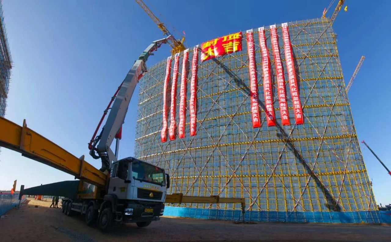 冬日寒風凜冽,但擋不住建設者奮戰(zhàn)的熱情。氣化裝置建設現(xiàn)場條幅高懸,炮聲不斷,充滿了喜慶的氛圍。11 月 28 日,氣化框架迎來重要里程碑——41.46m 喜迎混凝土封頂。泵車伸出長長的臂膀,把混凝土罐車拉來的混凝土送入氣化框架 41.46m 頂部。此次澆筑工程規(guī)模大,共需澆筑 685 立方米混凝土,現(xiàn)場投入2 臺 72 米泵車協(xié)同作業(yè),經過連續(xù) 11 小時的奮戰(zhàn),最終成功完成澆筑任務。